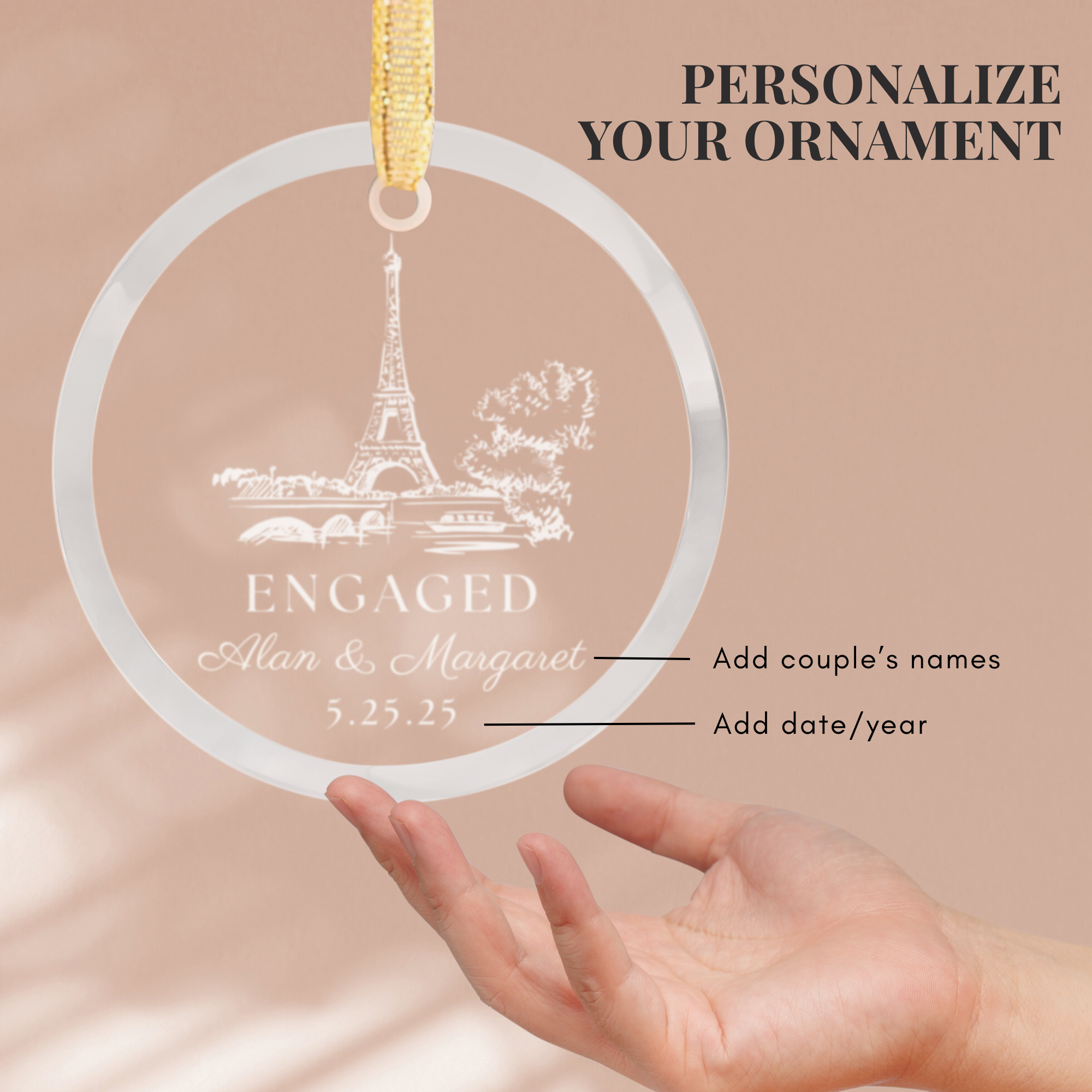 Celebrate an unforgettable Paris proposal with this elegant engagement glass ornament, personalized the couple’s names and their special date or year. Featuring an iconic Eiffel tower design, it’s a romantic keepsake to cherish for years to come.