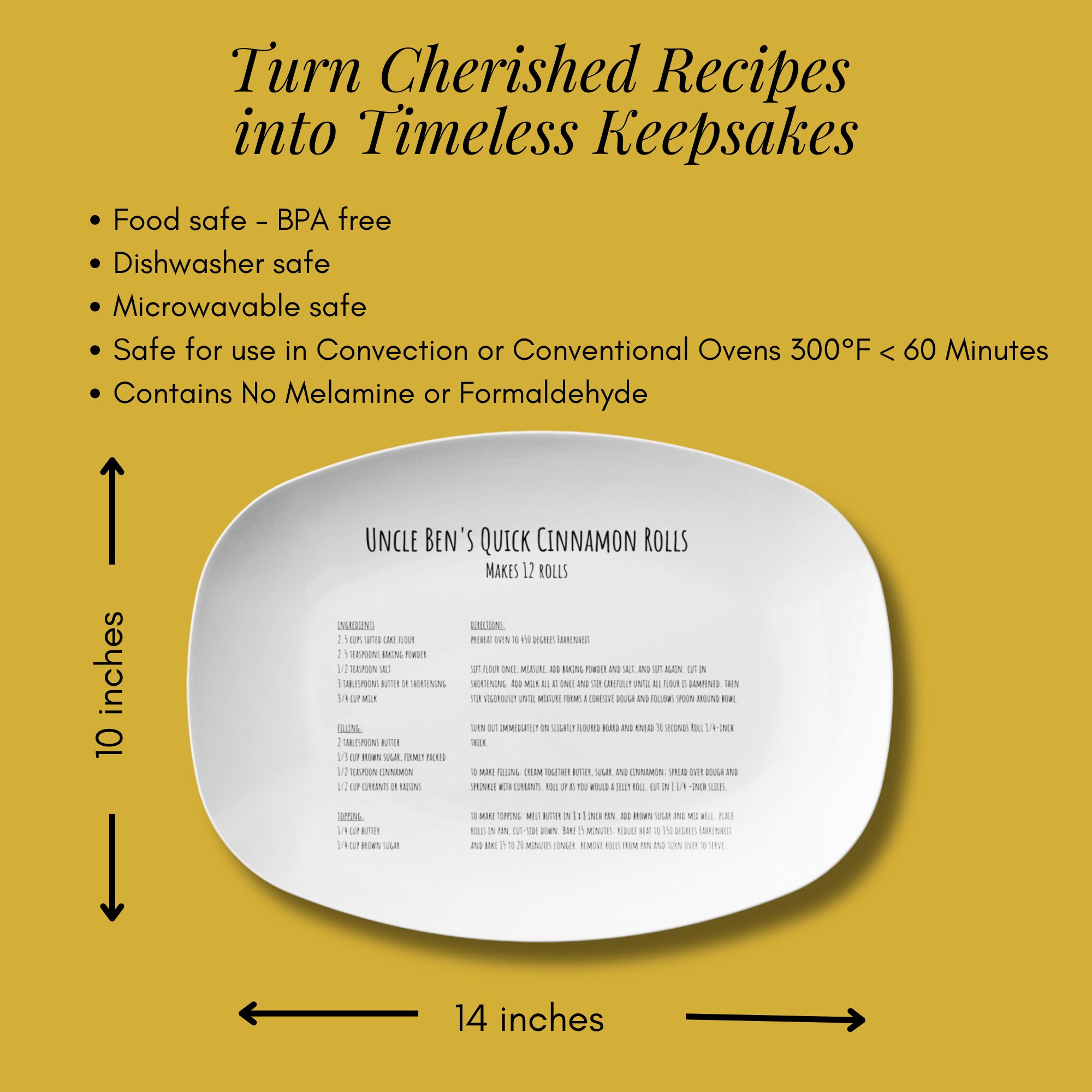 Celebrate family, tradition, and love with a personalized recipe platter. We transform your cherished handwritten recipe into a lasting heirloom, perfect for serving or display. Whether it’s Grandma’s famous cookies or Dad’s secret barbecue sauce, this custom platter preserves your loved one’s handwriting and the memories behind it.