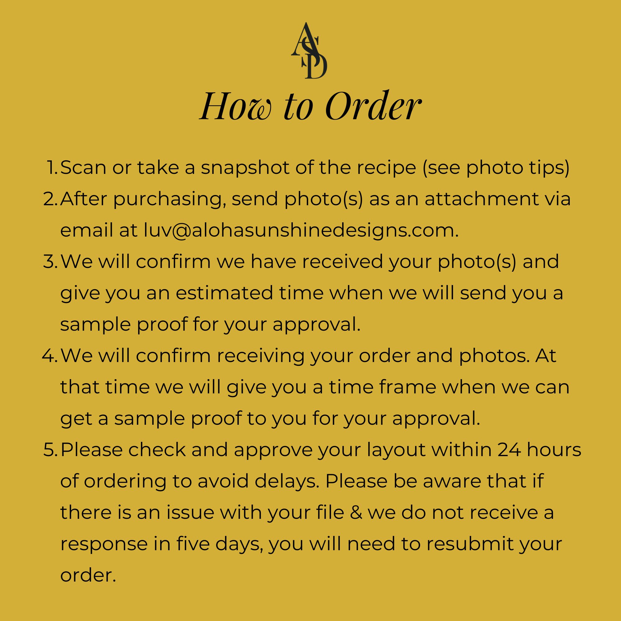 • Email us a photo of your recipe at lu*@******************ns.com. We will confirm we have received it and give you a time when we will complete a sample proof for you to approve.